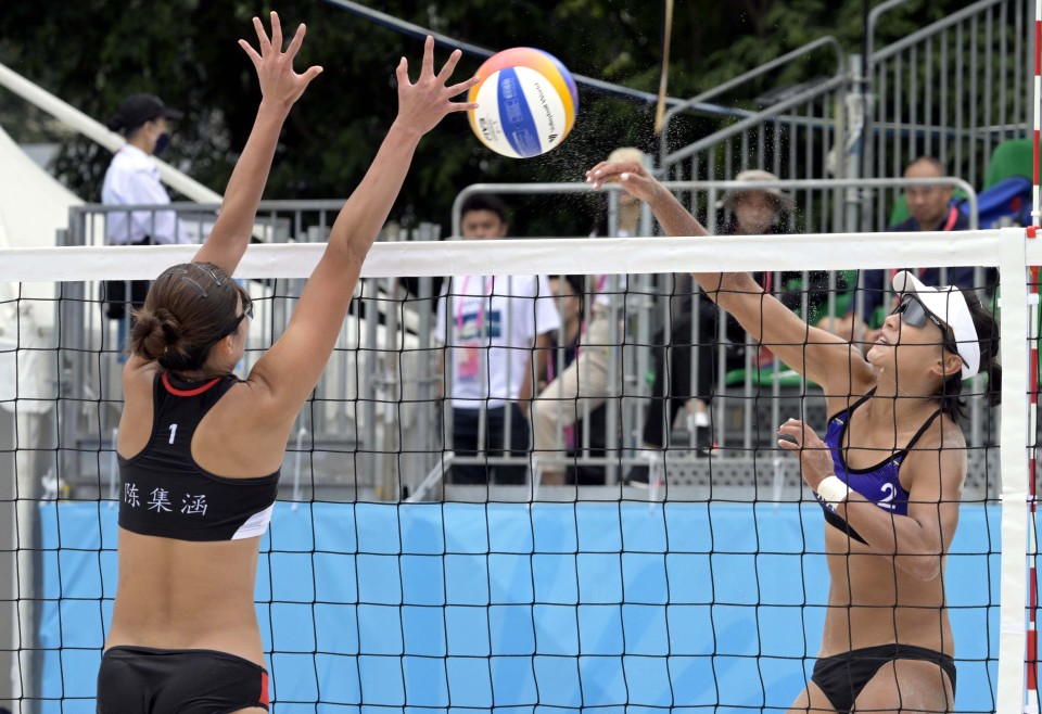 11月1日,新疆一队球员夏欣怡(右)在女子小组赛A组比赛中扣球。最终,新疆一队组合王婧哲/夏欣怡2比0战胜福建二队组合陈集涵/陈莹珊。新华社发(卢炳辉摄)